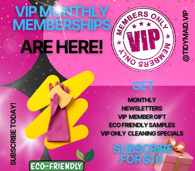 Get exclusive monthly news letters, eco friendly cleaning supplies, product samples, cleaning discounts and other amazing perks for just $10 monthly when you subscribe to Tidy Maid's VIP Membership.